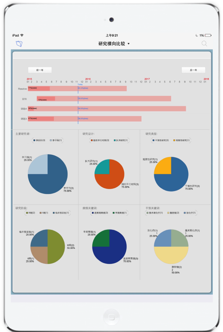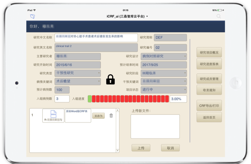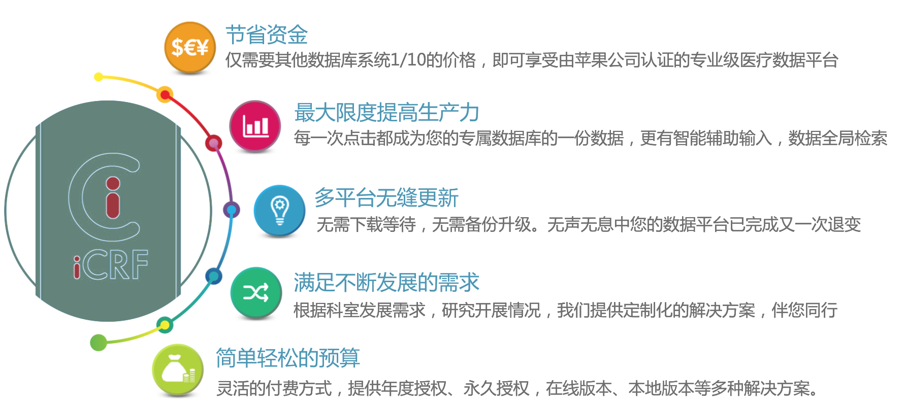 『iCRF智慧案例报告表』系统是一套为专业研究人员量身定制的移动数据库应用,为用户提供数据采集、质量管理、进度分析、痕迹追踪、离线同步、数据导出等多种功能,尤其适合需要多人、多地协同工作的研究项目。例如:中-大规模单中心或多中心临床研究项目,流行病学调研项目,消费者市场调查项目等。该应用为您的科室、您的实验室、您的公司、部门提供一个安全、专属的独立数据库,须经您认证的设备方可介入系统,无需担心您的数据保密问题。