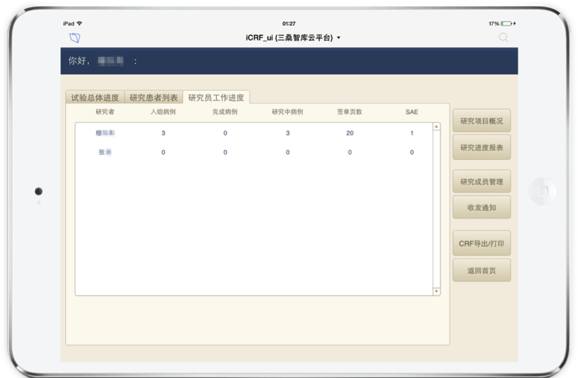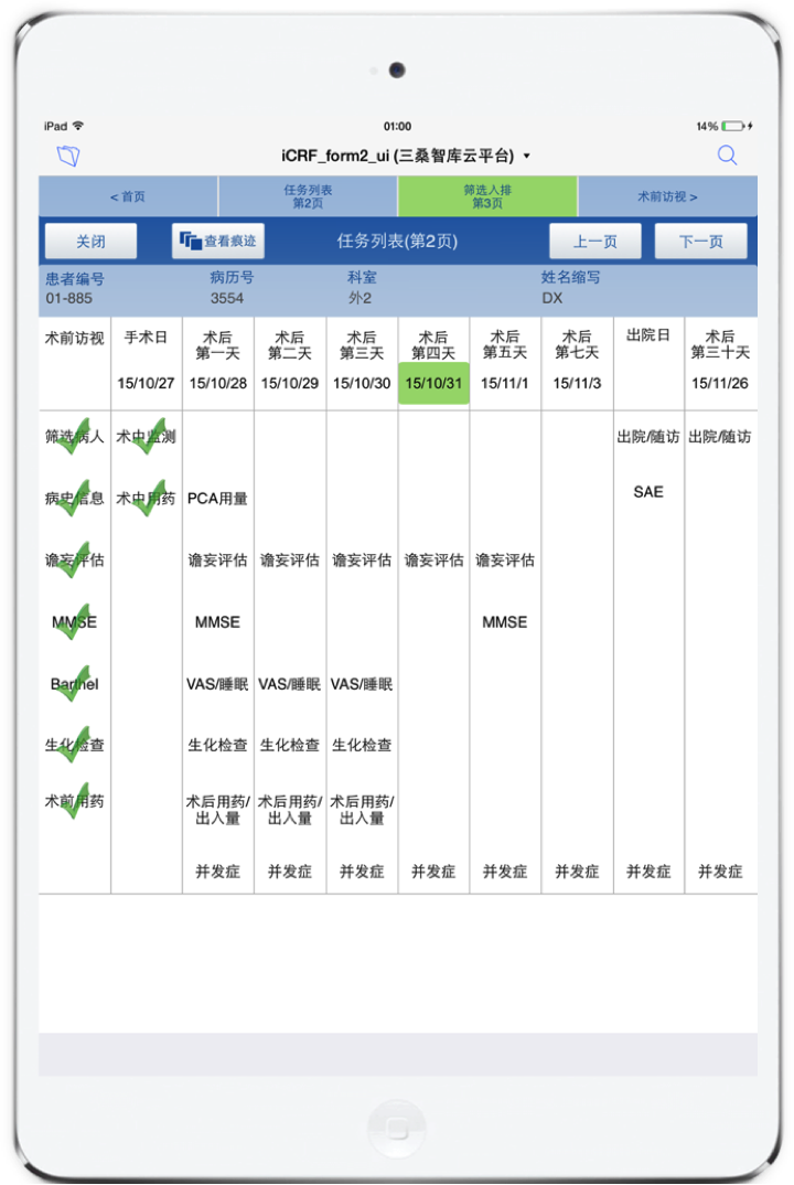 『iCRF』系统提供一目了然的研究案例列表,通过不同颜色区分,帮助您随时了解研究案例进度,并迅速定位至当前研究阶段。
