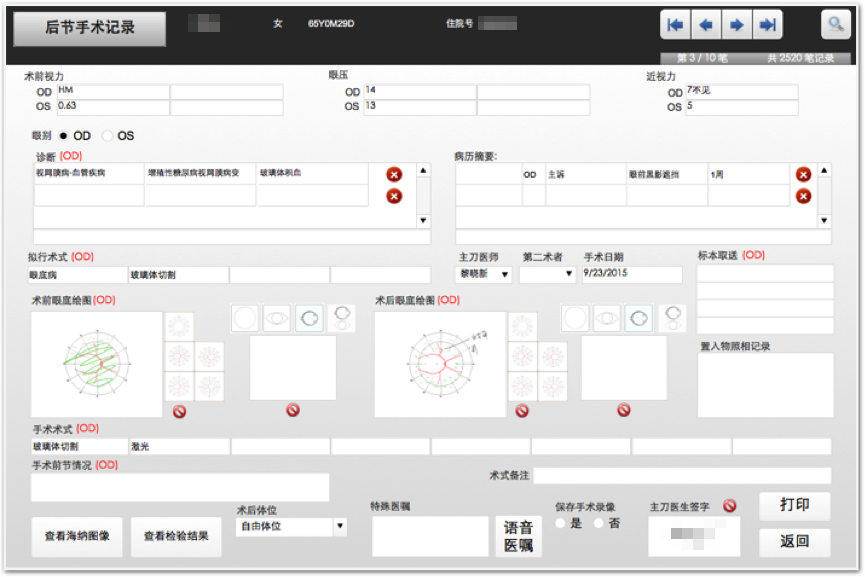 眼科病房管理及手术患者专业病历记录模块,本项目中设计眼底病组、眼外伤组、眼肿瘤组三个眼科亚专业的专业病历记录模块,依据眼科医生专业需求进行深度定制,将患者住院手术全程的核心数据资料进行规范化留存。