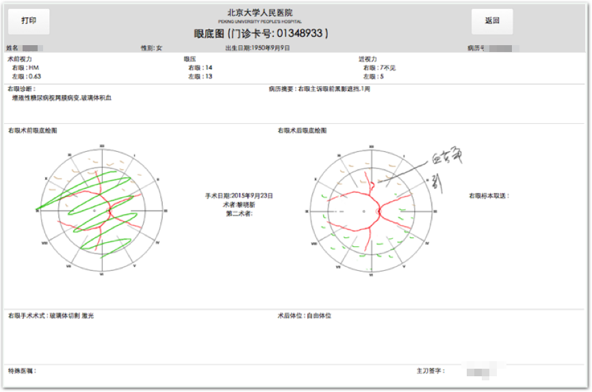 眼科门诊特殊检查及治疗管理记录随访模块,遵循眼科医师的临床习惯及临床记录规范,设计该项目中的全麻下眼检查记录模块,实现移动端眼科绘图记录及结构化点选,实时联通检查室与门诊诊室查阅检查记录。