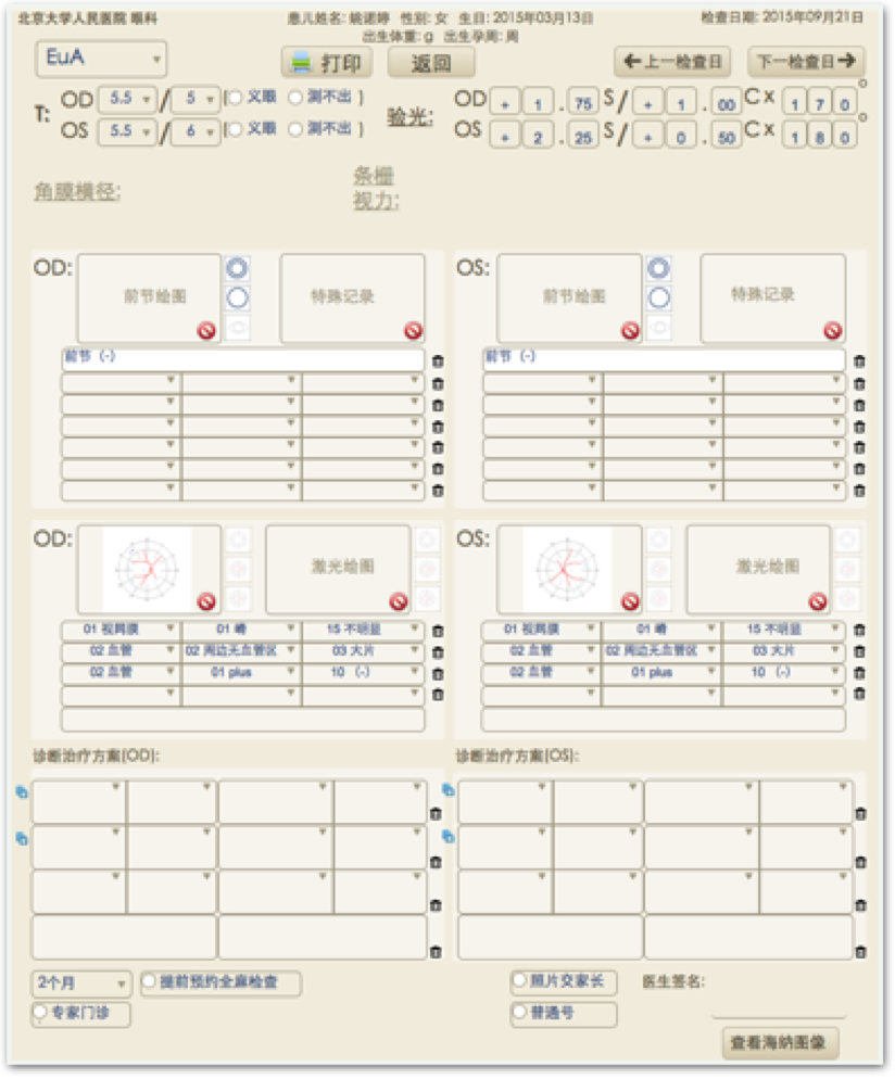 眼科门诊特殊检查及治疗管理记录随访模块,通过与His系统对接,实现患者就诊信息导入,通过iPad端与PC端应用,实现患者实时预约管理,通过本项目临床需求,实现早产儿相关数据资料采集及预约流程规范化管理。