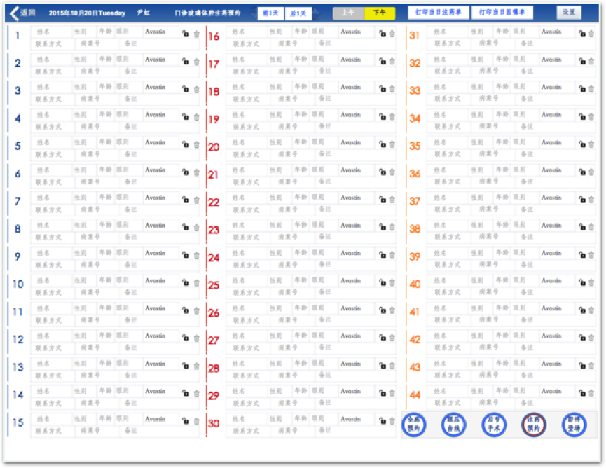 眼科门诊治疗预约记录随访模块,通过与His系统对接,实现患者就诊信息导入,通过iPad端与PC端应用,实现预约情况实时查询,本项目实现眼科门诊玻璃体腔注药治疗患者端数据采集及预约流程规范化管理。