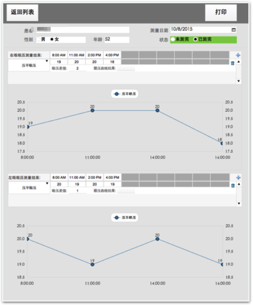 眼科眼压日曲线记录报告模块,提供每日分时点眼压数据采集功能,整合患者眼压信息并转换为折现图直观呈现,同时完成数据储存及定期随访。