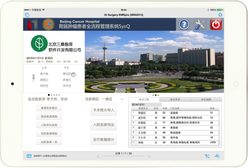 与北京大学肿瘤医院季加孚院长团队深度合作,为胃肠肿瘤外科量身定制“北京大学肿瘤医院胃肠肿瘤外科患者全流程管理系统SysQ”,目前已成为胃肠肿瘤外科运行病区不可或缺的科室专业临床信息化系统,承担胃癌专业数据库功能,极大提升临床工作效率,现已扩展至胃肠道肿瘤中心4个病区运行