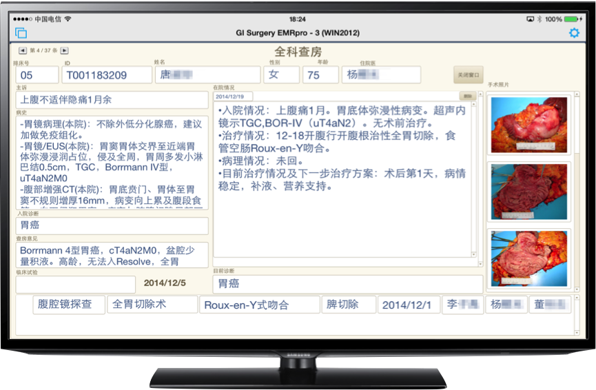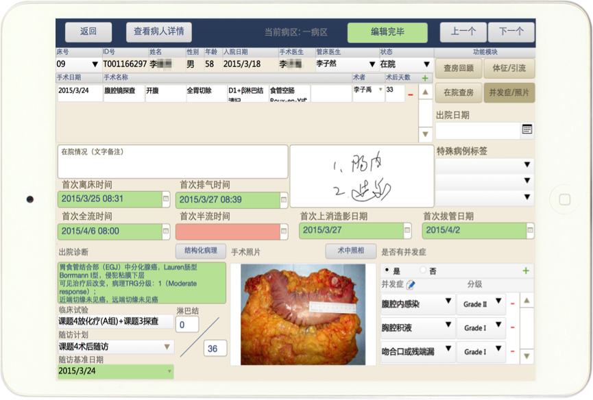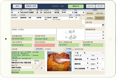遵循手术医师临床习惯及记录习惯设计界面模式,自动导入显示患者病史资料及检验及影像诊断结果;通过结构化点选模式记录手术术式、术中所见及肿瘤外科相关术中资料,通过移动端摄像功能直接记录组织标本的大体影像。